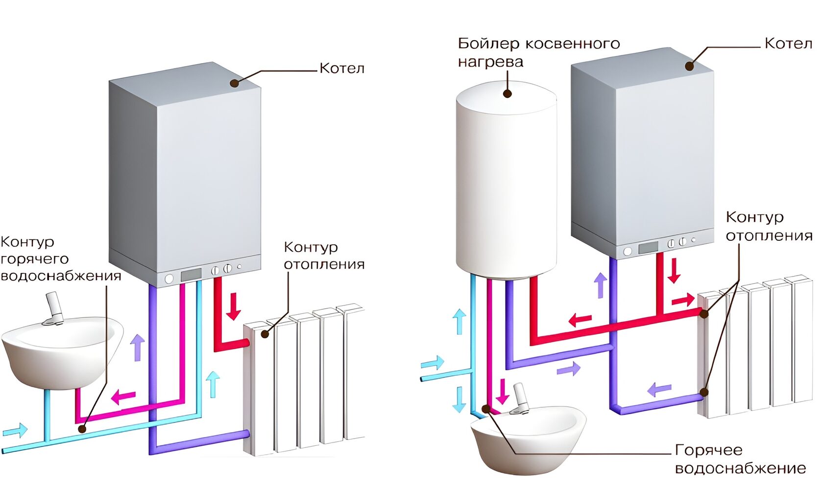 Схема сравнения одноконтурного и двухконтурного котлов