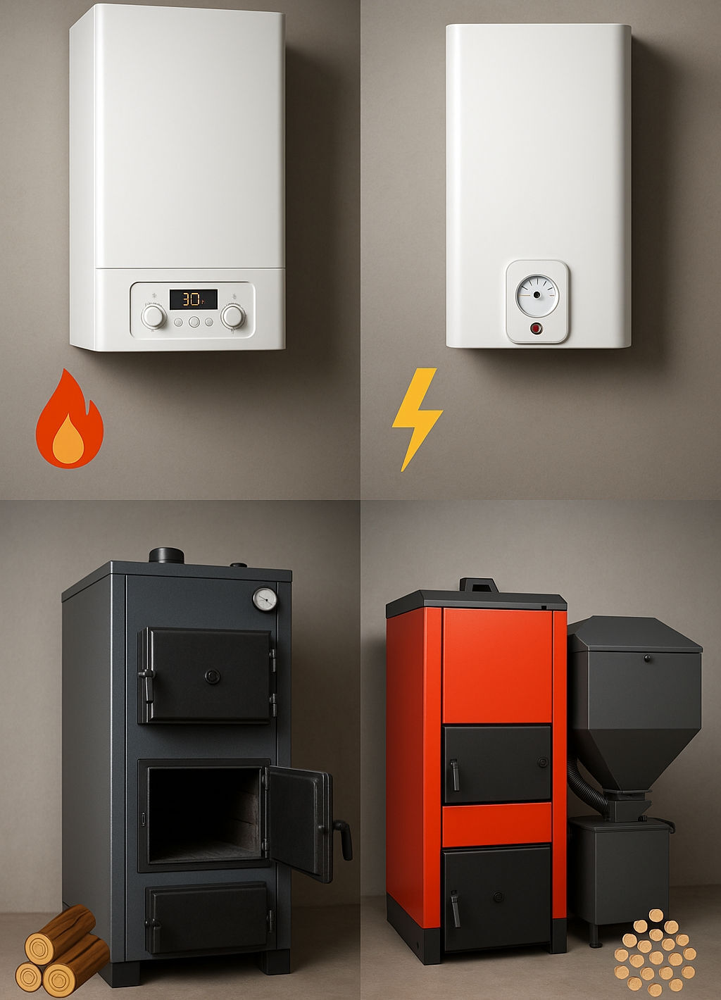 Коллаж из четырех типов котлов - газовый, электрический, твердотопливный, пеллетный