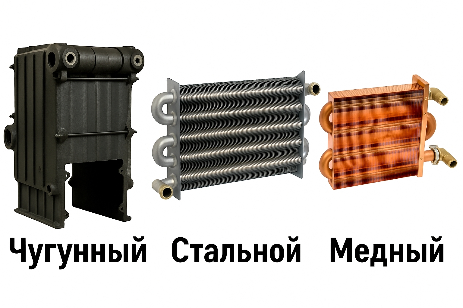 Технические иллюстрации трех теплообменников - чугунный, стальной, медный